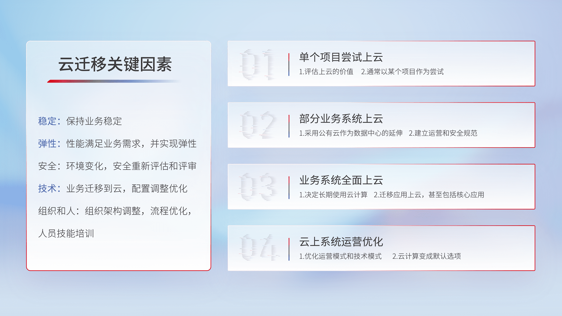 结合实际业务,,从规划设计、、、、云平台选型、、云原生改造、、数据迁移、、集成交付,,,,迁移全过程为客户识别最佳上云路径,,做好风险识别管理,,,,设计网络架构、、身份权限、、、安全审计合规、、、、操作审计、、、日志审计、、、监控告警策略、、、多站点容灾设计等,,,对云上基础设施进行整体规划,,,,提升IT治理水平,,以满足弹性、、高可用、、高性能的需求。。。。