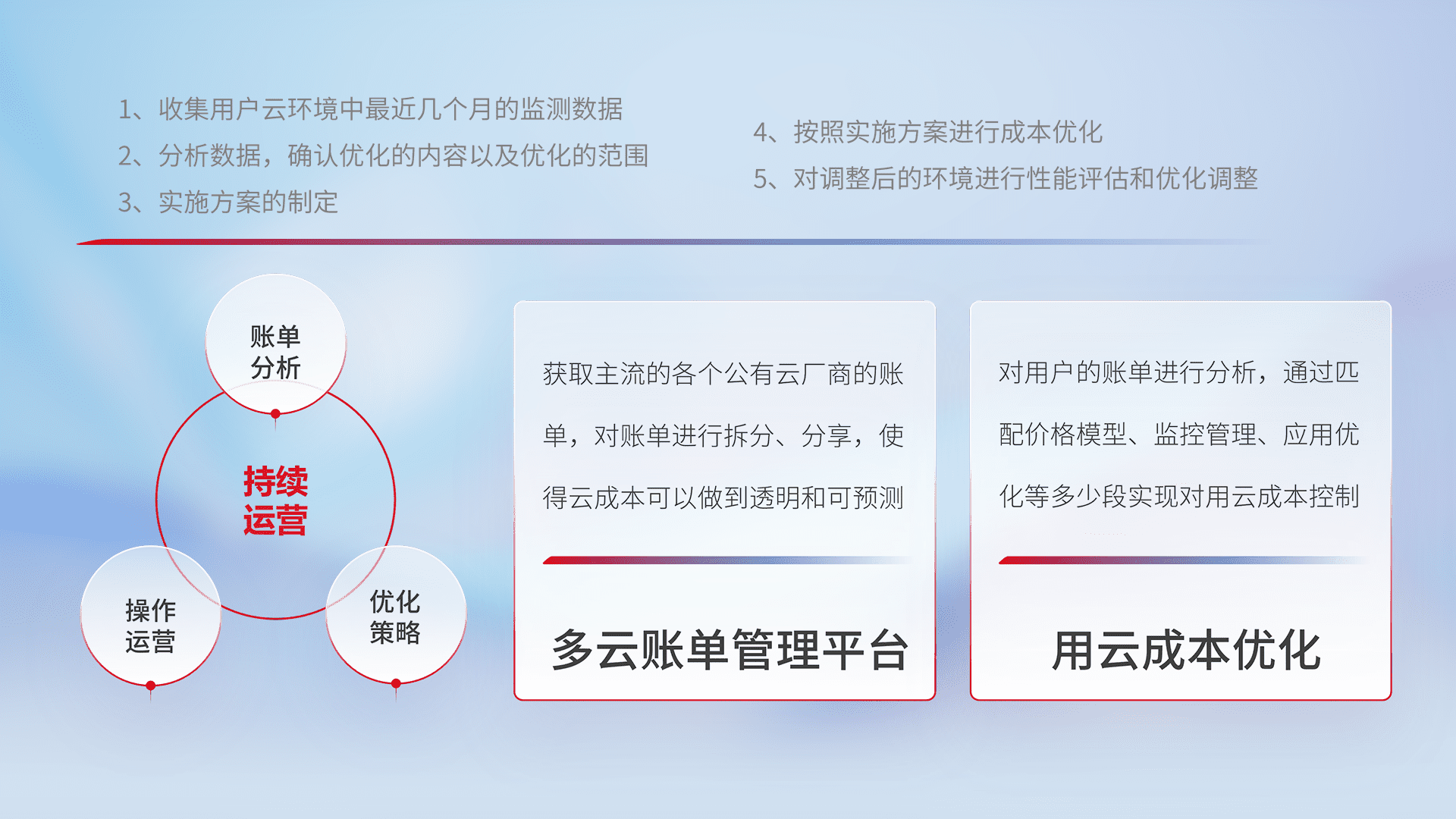 通过多云纳管,,以统一的资源数据模型把客户的云资源进行抽象和封装,,进而实现对多云资源的统一操作,,保障云资源管理的可靠性、、、稳定性与可用性。。。。量身定制化运维内容,,,配置、、、开发运维、、补丁管理、、、备份、、、监控、、、认证和访问管理、、审计和日常巡检等,,,保障在用云过程中的可靠度,,稳定度以及高可用率。。。。